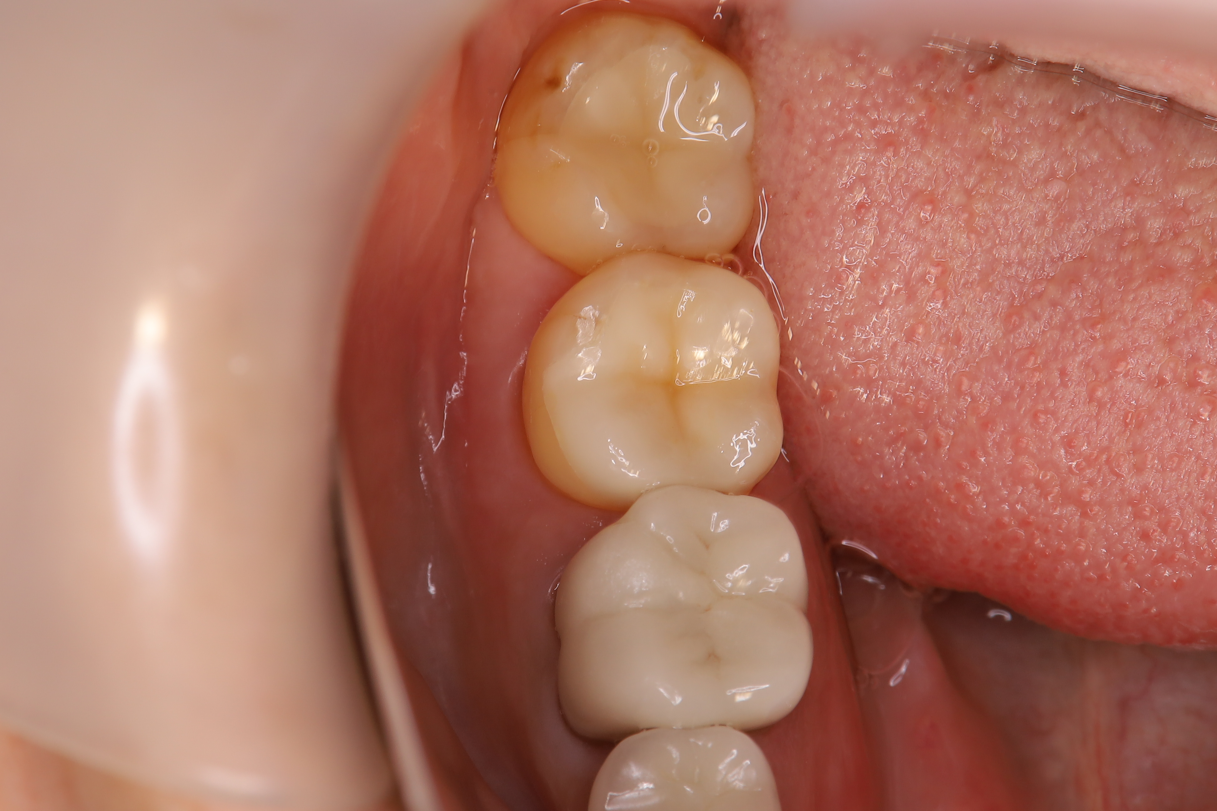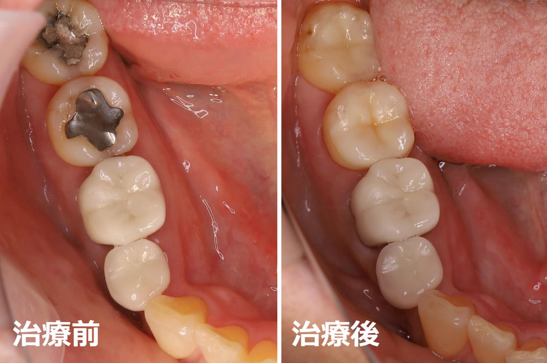 10年以上年前に初診でご来院になっており、現在も定期検診でご来院頂いています。 左下奥歯3歯と今回治療予定の奥歯の手前の2歯はすでに当院で銀歯の被せ物をセラミッククラウンにする審美歯科治療を行っています。検診でご来院のタイミングで少しずつ審美改善をされており、今回は下顎で最後に残っている右下奥歯2歯の治療をご希望されました。